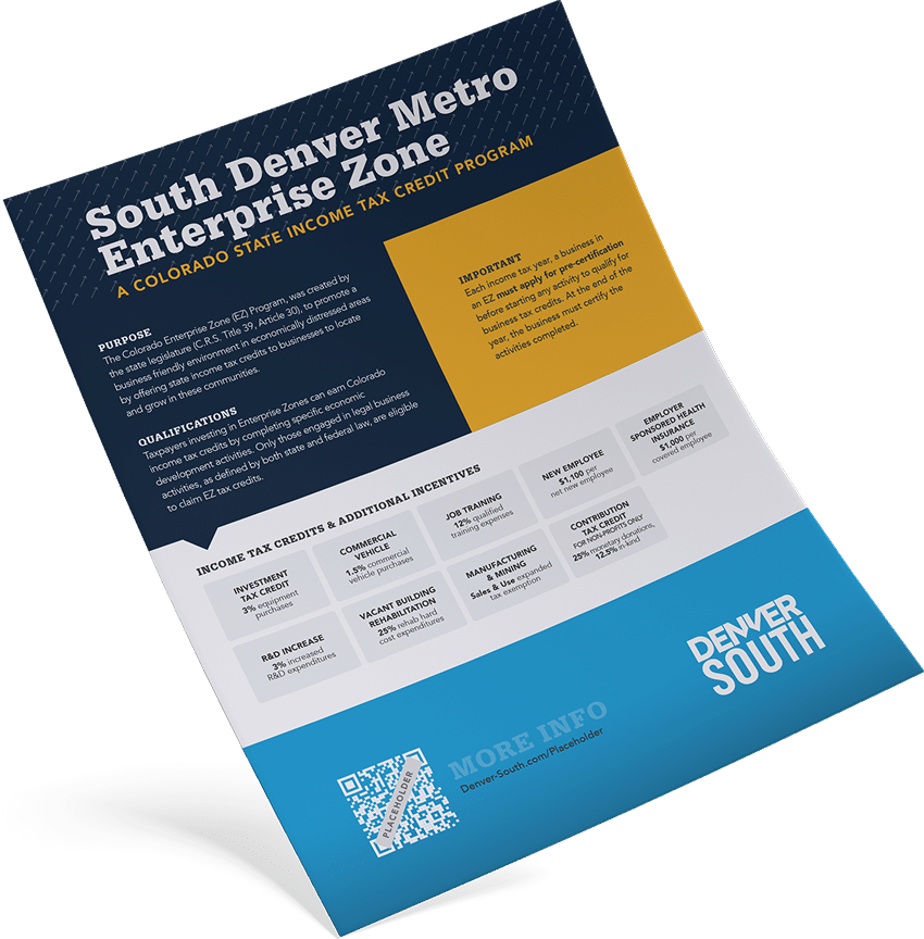 The Enterprise Zone Contribution Tax Credit provides a tax credit to Colorado taxpayers that contribute to targeted enterprise zone projects. When taxpayers make a certified contribution, they can claim, 25% of a cash donation as a state income tax credit and 12.5% of an in-kind donation as a state income tax credit. The amount of this tax credit is capped at $100,000 per taxpayer per tax year. If you cannot use all of your credits in a given tax year, you can carry forward the balance up to five years.